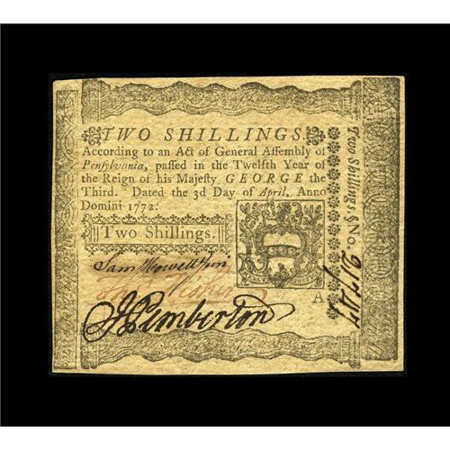 <B>Pennsylvania April 3, 1772 2s Choice New.</B></I> Three good signatures and fresh paper surfaces highlight this nice note.<BR><BR><b>Shipping:</b> Coins & Currency (<a target="_blank" href="http://www.heritageauctions.com/common/shipping.php">view shipping information</a>)