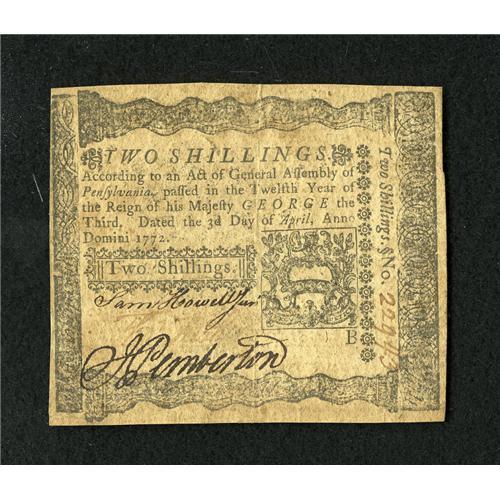 <B>Pennsylvania April 3, 1772 2s Extremely Fine-About New.</B></I> A very well margined and well signed About New note that has a little too much soiling for that grade.<BR><BR><b>Shipping:</b> Coins & Currency (<a target="_blank" href="http://www.heritageauctions.com/common/shipping.php">view shipping information</a>)
