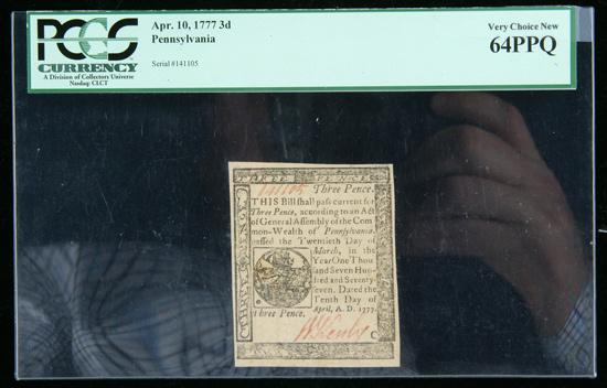 Pennsylvania. Aprill 10, 1777 3d. . Fr-PA-209. PCGS graded Very Choice New 64 PPQ.
