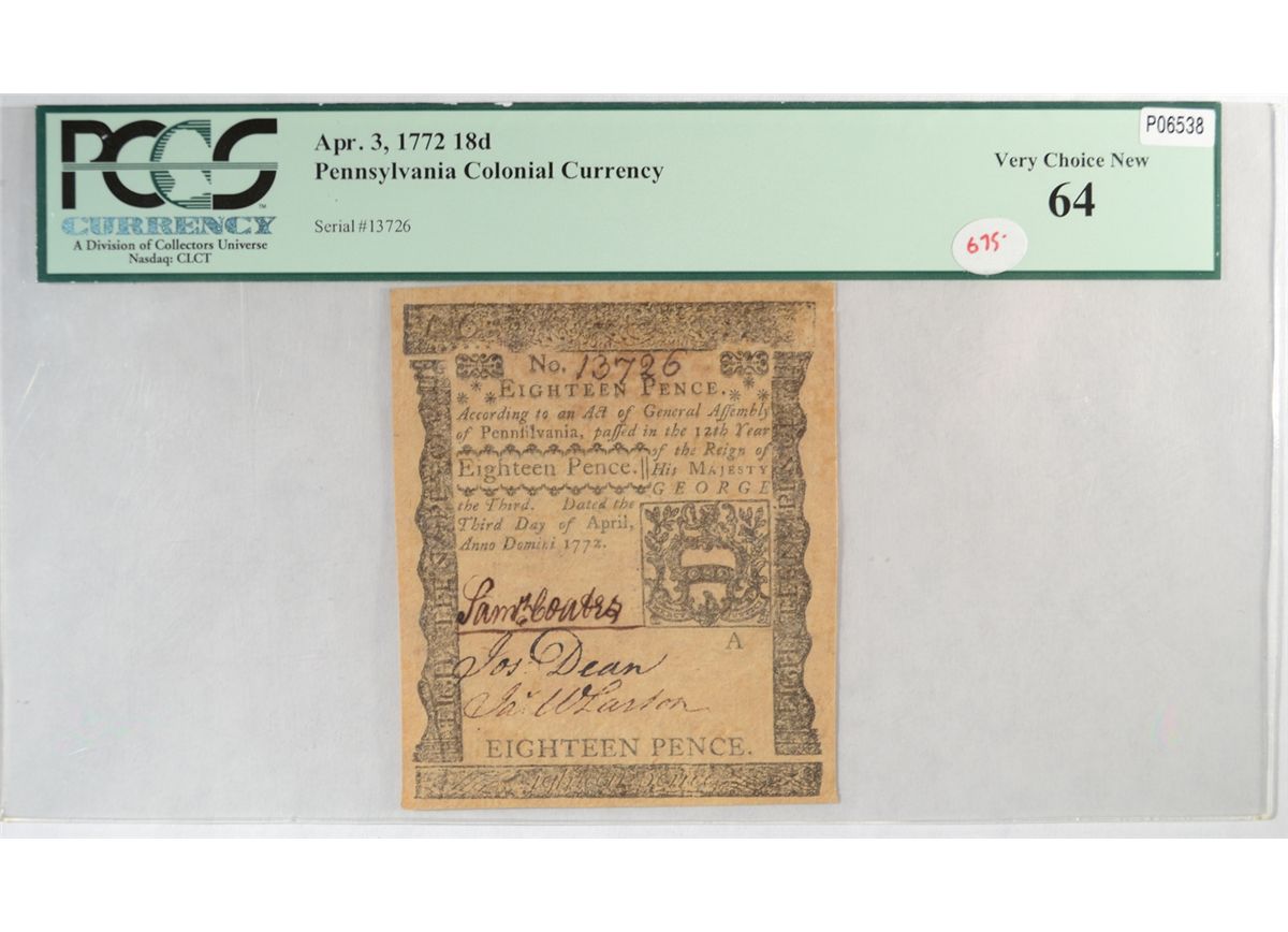 April 3rd 1772 18 Pence PCGS64 RARE RARE RARE est $850-$900