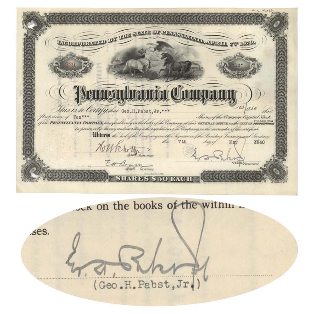 1940, Pennsylvania. Stock for 10 shares. Black. Large top center engraved vignette of the Pennsylvania state seal flanked by horses. Issued to and signed twice by George Pabst, Jr. Once as Vice President and again on the attached stock assignment. Very fine condition. Punch cancellations not affecting either of Pabst's signatures.