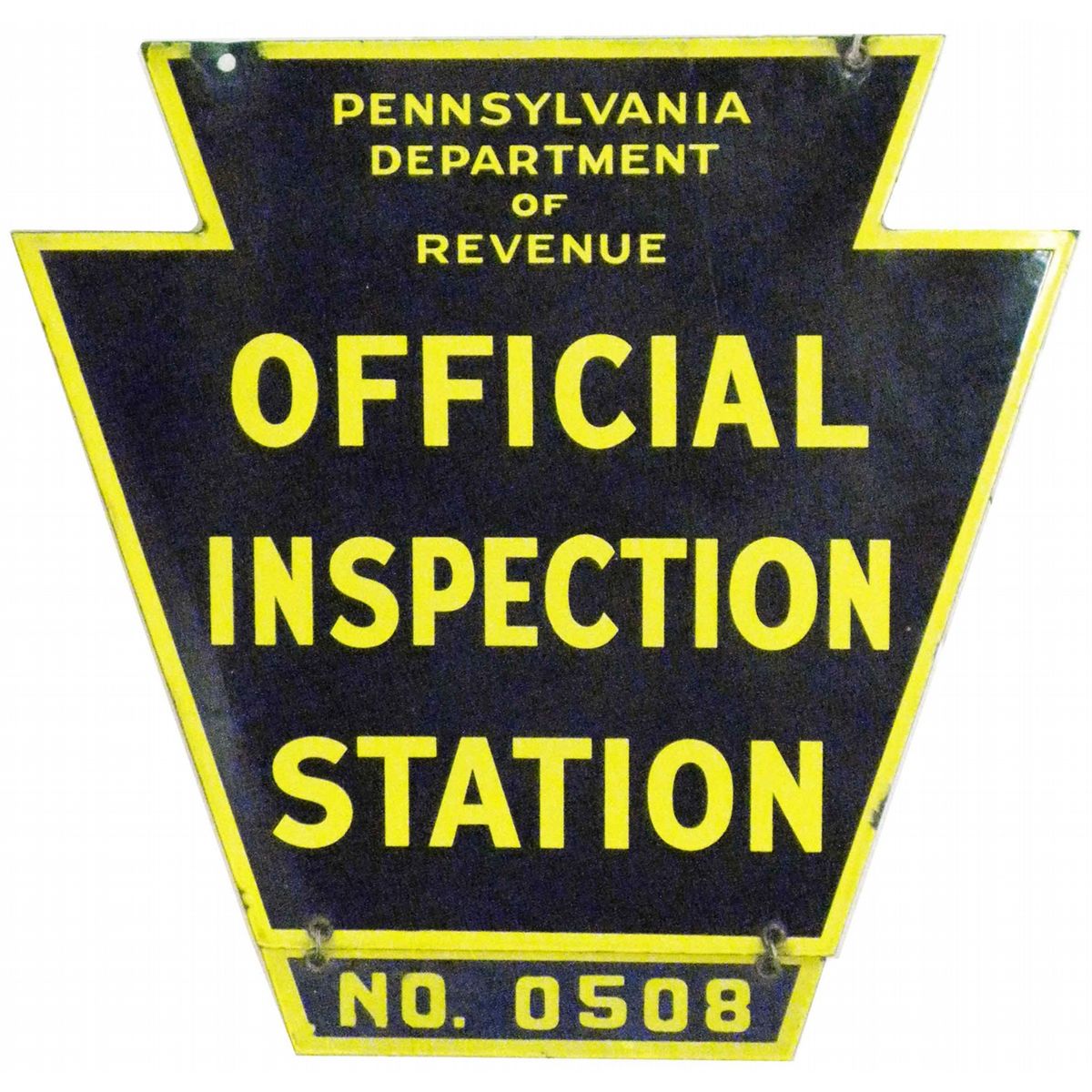Pennsylvania Department of Revenue Official Inspection Station Porcelain Sign, No. 0508. Chips at grommets otherwise good condition. 24 X 24 inches.