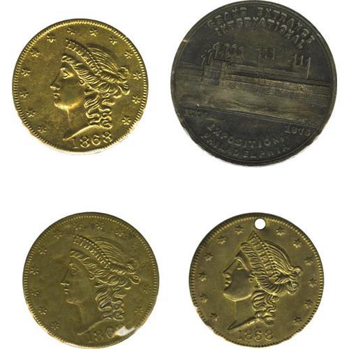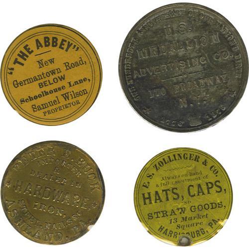 <B>Pennsylvania Embossed Shellcards and Centennial Exposition Medal.</B></I> Included are: Peter E. Buck Ashland Pa., 1868 Liberty Head (XF); E.S. Zollinger and Co., Harrisburg Pa. (yellow cardboard), 1868 Liberty Head (XF, holed through Harrisburg); "The Abbey" Philadelphia (orange cardboard), 1868 Liberty Head (AU); Centennial Exposition Grand Entrance (building pictured), reverse advertising U.S. Medallions Advertising Co., (silvered white metal, AU). 4 pieces.