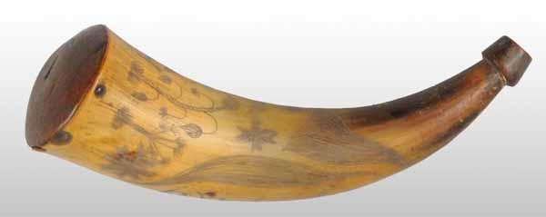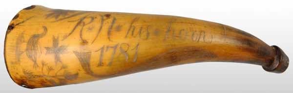 Description Engraved birds and floral designs along with bold script "R N his horn 1781". Condition (Good). Size 6 - 1/2" L.