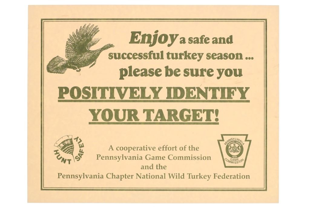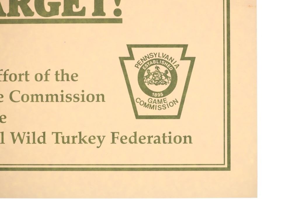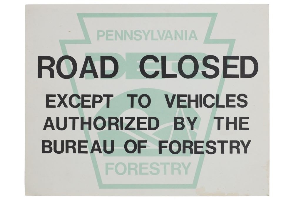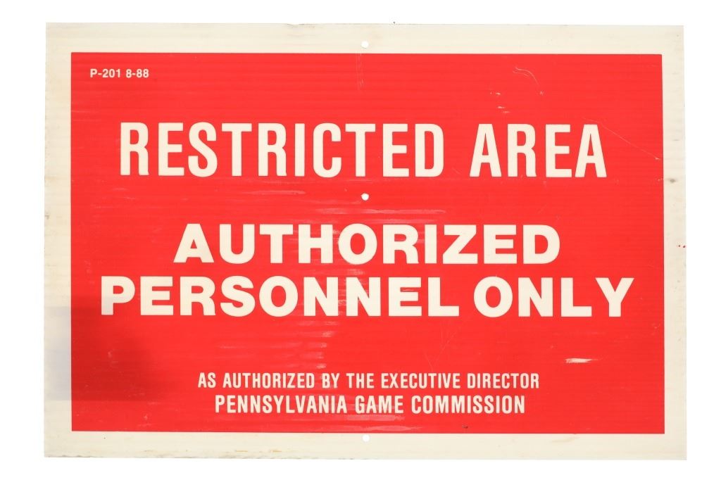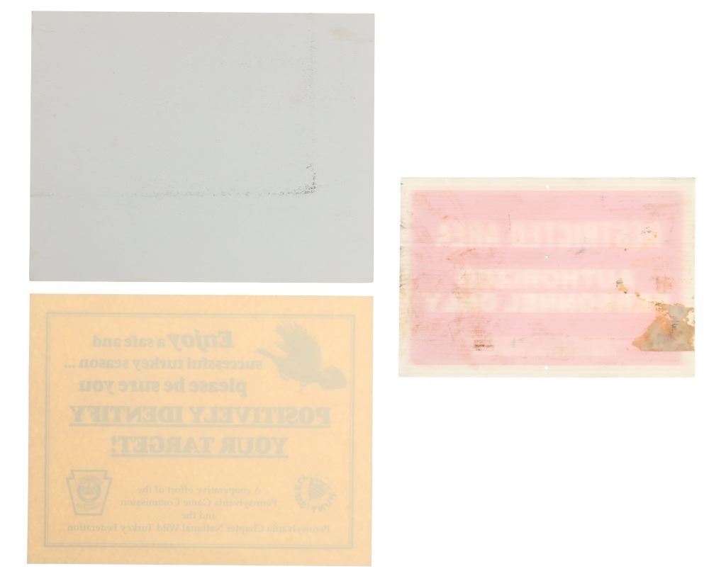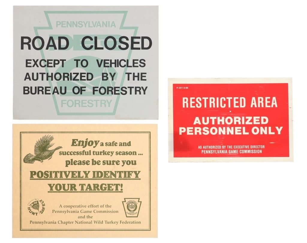 Featured in this lot are three Pennsylvania Game Commission signs circa 1960-80s. The first in this lot is a small red and white sign reading, "P-201 8-88 / Restricted Area Authorized Personnel Only / As Authorized by the Executive Director Pennsylvania Game Commission" in white lettering against a red background. The sign shows good condition with slight wear present. It measures 8 1/8" L x 12" W. The second in this lot is a paper sign reading, "Pennsylvania Forestry / Road Closed Except to Vehicles Authorized by the Bureau of Forestry" in black and light green lettering. The paper signs shows good condition overall with little wear present. It measures 11" L x 13 15/16" W. The final paper sign reads, "Enjoy a safe and successful turkey season... please be sure you POSITIVELY IDENTIFY YOUR TARGET! / A Cooperative effort of the Pennsylvania Game Commission and the Pennsylvania Chapter National Wild Turkey Federation" and shows a "Hunt Safe" logo on the left, the Pennsylvania Game Commission logo on the right and a an image of a turkey in the top left. The sign shows good condition overall with little wear present. It measures 11" L x 13 15/16" W.
