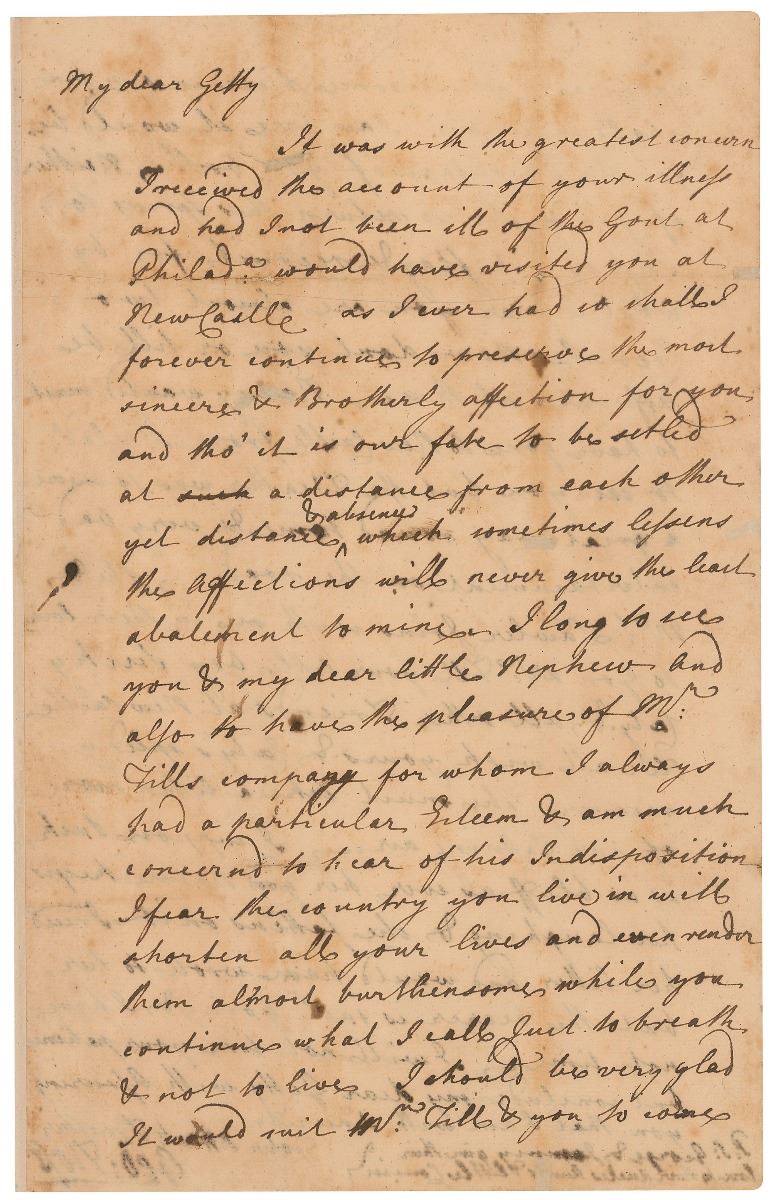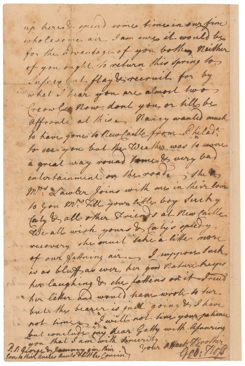 Signer of the Declaration of Independence from Pennsylvania (1730–1779) whose nephew married the famous flagmaker Betsy Ross in 1773. Rare ALS, signed, "Geo: Ross," one page, both sides, 7.5 x 11.75, no date. Letter to his brother Getty, in full: "It was with the greatest concern I received the account of your illness and had I not been ill of this Govt. at Philada. would have visited you at New Castle as I ever had so shall I forever continue to preserve the most sincere & Brotherly affection for you, and though it is our fate to be settled at a distance from each other yet distance & absence which sometimes lessens the affections will never give the least abatement to mine. I long to see you & my dear little nephew and also to have the pleasure of Mr. Tills company for whom I always had a particular Esteem & am much concerned to hear of his Indisposition. I fear the country you live in will shorten all your lives and even render them almost burdensome while you continue what I call Just to breath & not to live I should be very glad. It would suit Mr. Till & you to come up here & spend some time in our fine wholesome air. I am sure it would be for the advantage of you both. Neither of you ought to return this spring to Sussex [County, Delaware] but play & recruit for by what I hear you are almost two Creowls. Now don't you or Till be affronted at this—Nancy wanted much to have gone to New Castle from Philad[elphi]a to see you but the Weather was to[o] severe a great way round home & very bad entertainment on the road—She & Mrs Lawler Joins with me in their love to you Mr: Till your little boy Sercky Caty & all other Friends at New Castle. We all wish yours & Caty's speedy recovery she must take a little more of your Fatt’ning air—I suppose such is a bluff as ever her good nature keeps her laughing she fattens on it. I rec'd her letter and would have wrote to her but the bearer is just going & I have not time—I will not live your patience but conclude my dear Getty with Assuring you that I am." Professionally inlaid into a slightly larger sheet and in very good condition, with intersecting folds, scattered overall soiling and toning, and old repairs to tiny areas of paper loss.