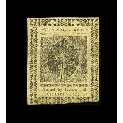 <B>Pennsylvania July 20, 1775 10s Extremely Fine.</B></I> This "A" plate note has a couple of folds visible more on the back with a the bottom margin slightly askew. There is also a small notch out of the right pillar. Dark inks and quality signatures round out this example.