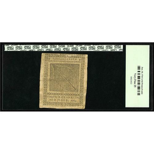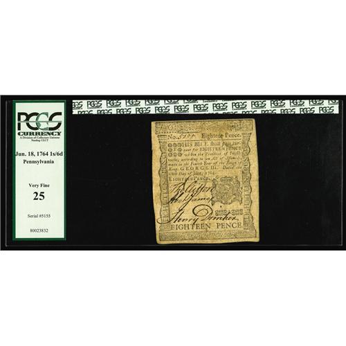 <B>Pennsylvania June 18, 1764 1s/6d PCGS Very Fine 25.</B></I> As scarce notes go this certainly is one. This is the first time this Benjamin Franklin printed note has graced a Heritage/CAA sale. The print quality is nice and the signatures strong with good overall color.