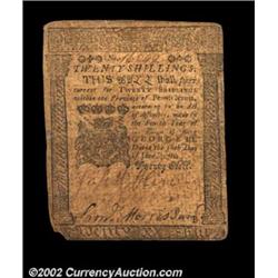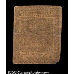 Pennsylvania June 18, 1764 20s Fine. A small piece of the lower left corner is missing on this larger-format 1764 Pennsylvania issue. The face of the note is considerably stronger than the back, although the "B. Franklin" imprint on the back is clear and bold. Important notice: We expect to be auctioning lots at the rate of 200-250 per hour. Sometimes eBay Premier live bid software cannot keep up with that pace, so we strongly recommend that you place a realistic proxy bid now as insurance to avoid disappointment. Also please note that all Heritage/CAA lots purchased through eBay Premier carry a 20% Buyer's Premium. Please make sure you read the Terms and Conditions.