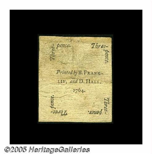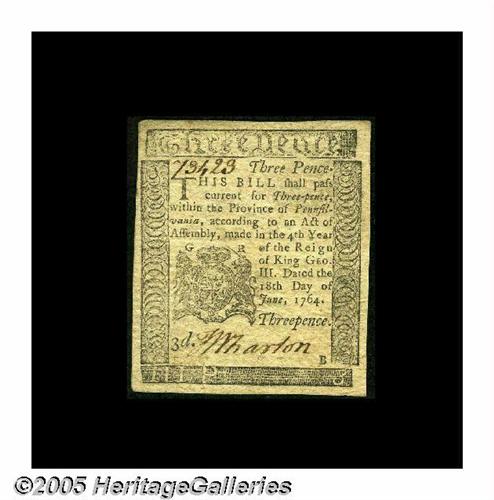 <B>Pennsylvania June 18, 1764 3d Extremely Fine.</B></I> This is a note generally seen either in Gem condition or wretchedly worn. This one has circulated lightly and is problem-free. A great example of a note printed by Benjamin Franklin with his imprint bold and clear.