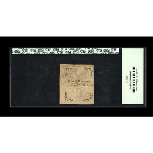 <B>Pennsylvania June 18, 1764 3d PCGS Extremely Fine 40.</B></I> This is a note generally seen either in Gem condition or wretchedly worn. This one has circulated lightly and is problem-free. A great example of a note printed by Benjamin Franklin with his imprint bold and clear.<BR><I>From The Troy Wiseman Collection</B></I>