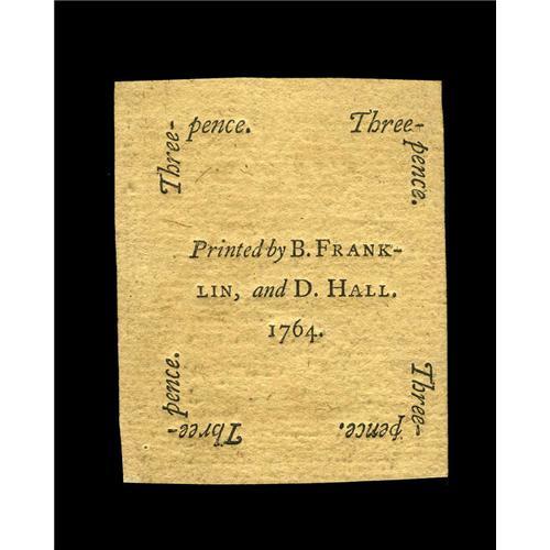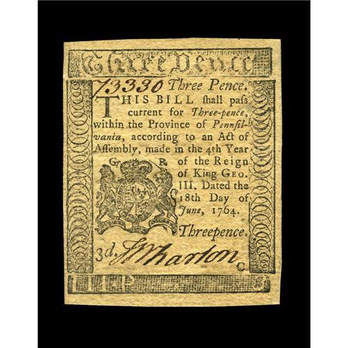<B>Pennsylvania June 18, 1764 3d Very Choice New. </B></I> A beautifully margined example of this small change note. These low denomination 1764 notes are the only Ben Franklin printed pieces that are ever available in uncirculated condition. A very nicely margined note with a strong signature and serial number that comes quite close to the full Gem grade.