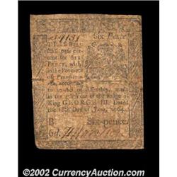 Pennsylvania June 18, 1764 6d Fine. The face is solid for the grade, with all the text clear. The ba