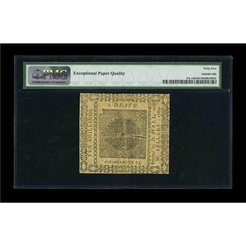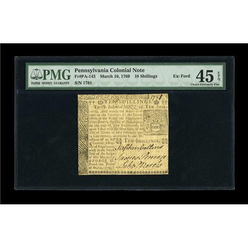 <B>Pennsylvania March 10, 1769 10s PMG Choice Extremely Fine 45 EPQ.</B></I> Not a very rare note in lower grade even though only 2000 pieces of this denomination were originally printed. In Very Fine and above it is a major rarity, and this XF45 EPQ is the finest example we have ever seen. This issue was printed "for the relief and employment of the poor in the city of Philadelphia" and is often referred to as Bettering House money. This piece from the Ford Collection realized $1,060 when last auctioned. Now, in its 45 EPQ holder, it is likely to do a fair bit better.<BR><BR><b>Shipping:</b> Coins & Currency (<a target="_blank" href="http://www.heritageauctions.com/common/shipping.php">view shipping information</a>)