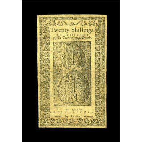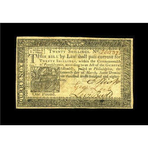 <B>Pennsylvania March 16, 1785 20s Extremely Fine.</B></I> Broad and even margins are found on this well signed example from this scarcer final issue.<BR><BR><b>Shipping:</b> Coin/Currency (<a target="_blank" href="http://www.heritageauctions.com/common/shipping.php">view shipping information</a>)