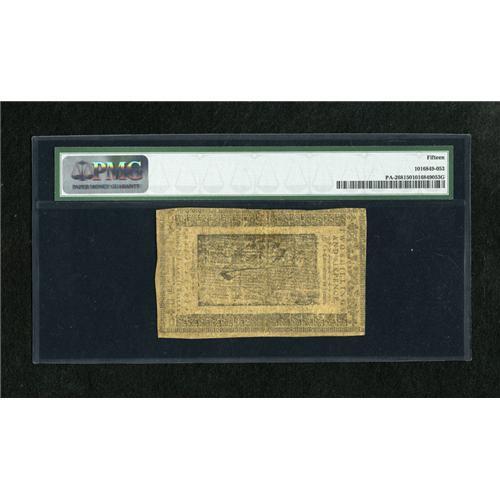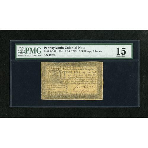 <B>Pennsylvania March 16, 1785 2s/6d PMG Choice Fine 15.</B></I> A well signed and numbered example from this scarcer final Pennsylvania issue which certainly looks to be a Very Fine note.<BR><BR><b>Shipping:</b> Coins & Currency (<a target="_blank" href="http://www.heritageauctions.com/common/shipping.php">view shipping information</a>)