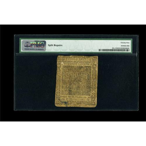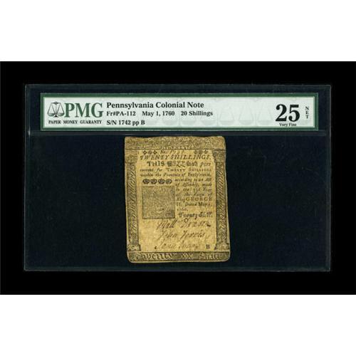<B>Pennsylvania May 1, 1760 20s PMG Very Fine 25 Net.</B></I> This note was printed in the shop of Ben Franklin and David Hall. The third-party label reads, "split repairs."<BR><BR><b>Shipping:</b> Coins & Currency (<a target="_blank" href="http://www.heritageauctions.com/common/shipping.php">view shipping information</a>)