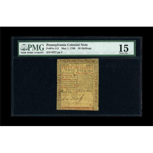 <B>Pennsylvania May 1, 1760 50s PMG Choice Fine 15.</B></I> We have handled about a half dozen examples of this denomination. This piece is moderately circulated with the splits often seen on the center fold of Colonial issues. Fortunately, it is wholly original.<BR><BR><b>Shipping:</b> Coins & Currency (<a target="_blank" href="http://www.heritageauctions.com/common/shipping.php">view shipping information</a>)