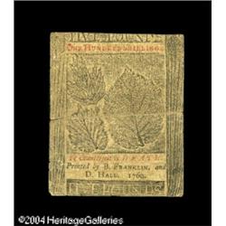 Pennsylvania May 1, 1760 L5 Very Fine. Really high grad <B>Pennsylvania May 1, 1760 $5 Very Fine.</B></I> Really high grade for the issue and essentially problem free, with just very minor splits at the ends of its horizontal center fold. All three signatures remain sharp. <BR><BR><B>Important notice:</B> Heritage usually auctions material at the rate of 200-250 lots per hour. On some occasions eBay Live bid software or the Internet may not be able to keep up with the pace of the auction. We recommend placing a realistic absentee bid now as insurance to avoid disappointment. Occasionally the auctioneer may eliminate or reject an eBay Live bid, and the auctioneer may also reopen a lot after the close of the eBay live bidding (usually because we missed an audience bid), and may reject your bid even if it shows you as the winning bidder. By bidding via eBay Live, you agree that Heritage may award the lot to another bidder at its sole discretion under the circumstances described above or any other reasonable circumstances. Since eBay bids are not shown to us until we open the lot on the floor, we treat those bids just like floor bids. In most cases the floor responds before the eBay bid is presented to us, due to Internet lag time, so for consistency we have made it a policy that floor bids are always considered first over tie eBay live bids. Also please note that all Heritage lots purchased through eBay Live carry a 20% Buyer's Premium. Please make sure you read the Terms and Conditions before you bid. This lot is being auctioned in conjunction with a live floor auction by Heritage Galleries & Auctioneers. All final auction and invoice information will be supplied by Heritage Galleries & Auctioneers, and all other information should be considered preliminary. Lot:15253