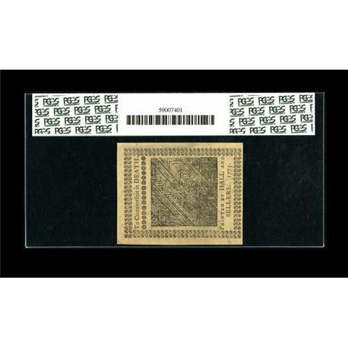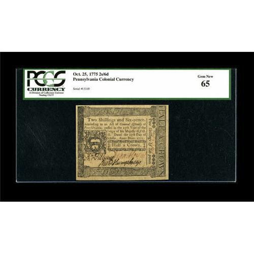 <B>Pennsylvania October 25, 1775 2s/6d PCGS Gem New 65.</B></I> This is a nicely margined example with bold black signatures. <BR><BR><b>Shipping:</b> Coins & Currency (<a target="_blank" href="http://www.heritageauctions.com/common/shipping.php">view shipping information</a>)