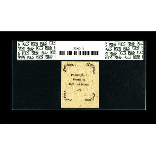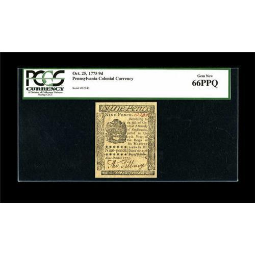 <B>Pennsylvania October 25, 1775 9d PCGS Gem New 66PPQ.</B></I> Dark penmanship, paper originality, full margins, and precise printing all add up on this beautiful note. <BR><BR><b>Shipping:</b> Coins & Currency (<a target="_blank" href="http://www.heritageauctions.com/common/shipping.php">view shipping information</a>)