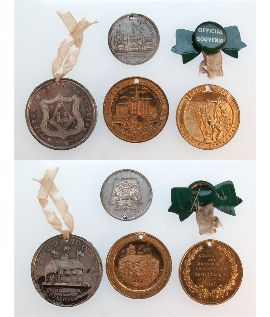 1.) THE BIBLE AND OUR FLAG with original ribbon *very elusive high grade 2.) SEWICKLEY CENTENNIAL with official green souvenir pin / 1940 3.) MEADVILLE SESQUI-CENTENNIAL 1938 (holed) 4.) LYCOMING COUNTY CENTENNIAL 1895 (holed)