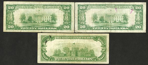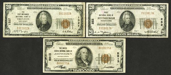 Pennsylvania, Lot of 3 notes, Includes Ch#252, First National Bank at Pittsburgh, $20, Type1, Fine to Choice Fine; Ch#1327, First Mechanics National Bank of Trenton, $20, Type 1, VF; and Ch#5913, United States National Bank of Johnstown, $100, Type 1, S/N B000275, VF. Attractive quartet of Pennsylvania Nationals.