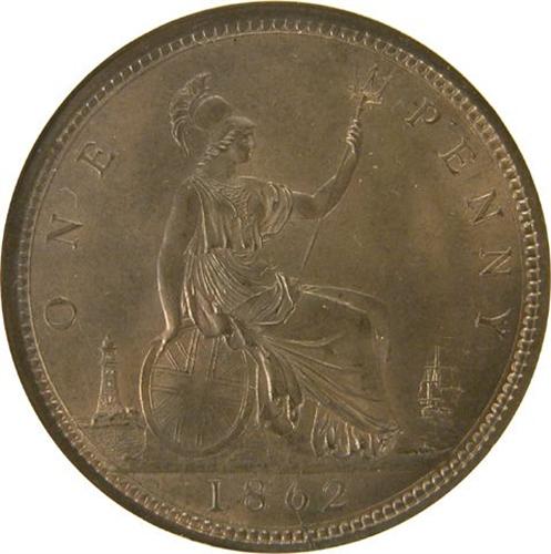 Penny 1862 NGC MS-65 Red and Brown. A strongly struck piece with about 25% remaining red