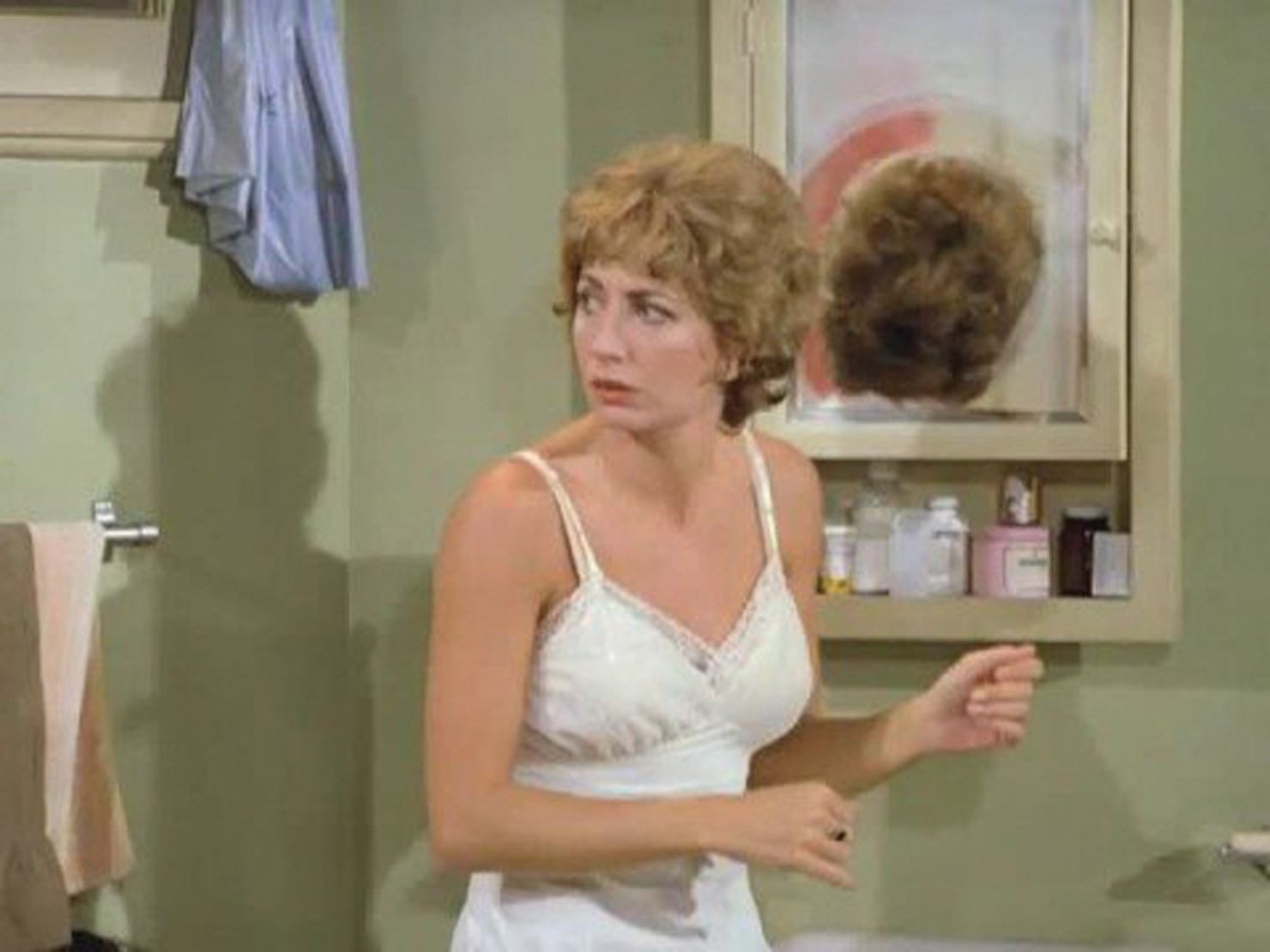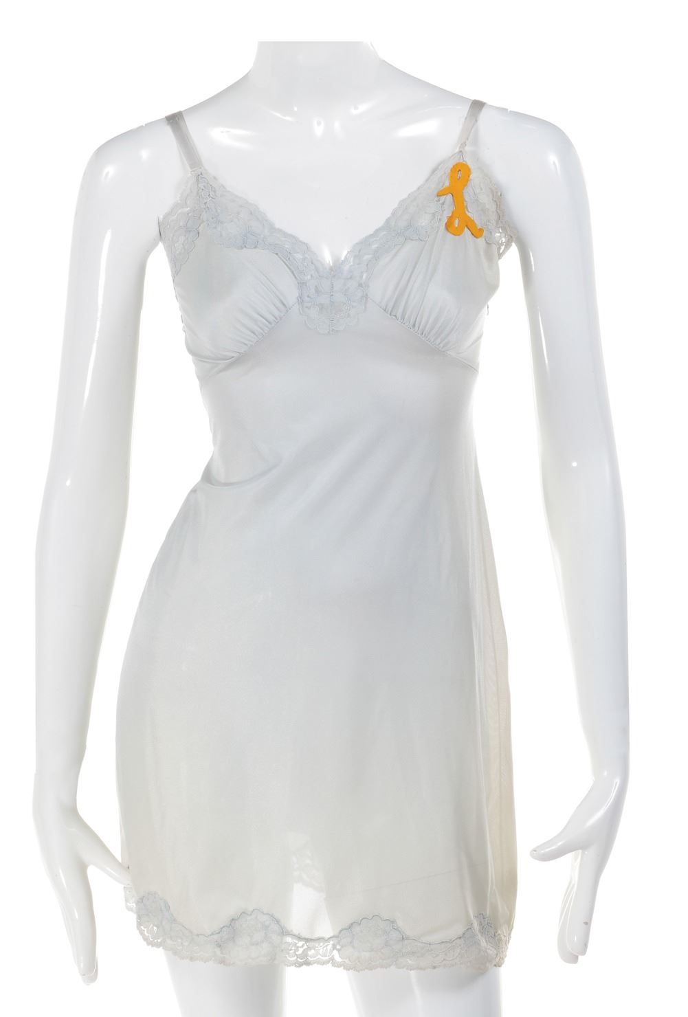 135. Penny Marshall Laverne DeFazio monogram slip from Laverne & Shirley.(ABC, 1976-83) Vintage original pale blue slip with adjustable ribbon straps, lace trim at v-neck and hem, and trademark yellow felt "L" stitched to left chest. Exhibiting production wear and age. In vintage very good to fine condition. $400 - $600