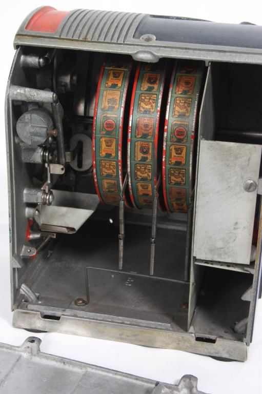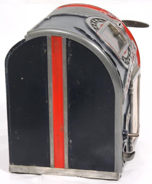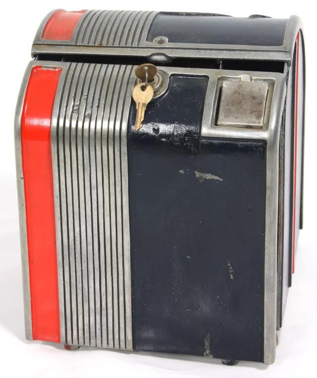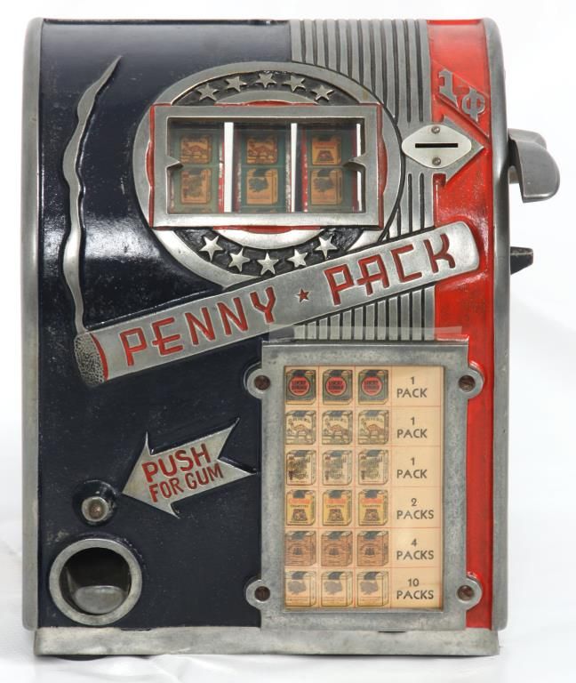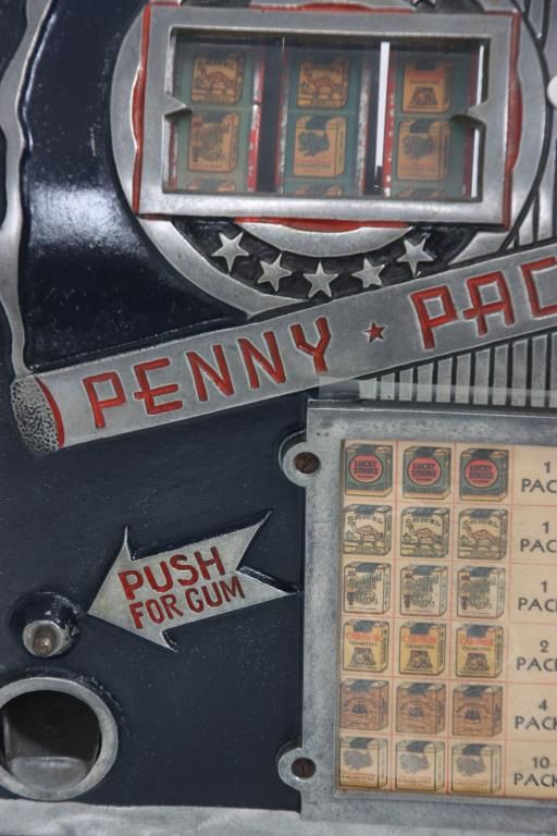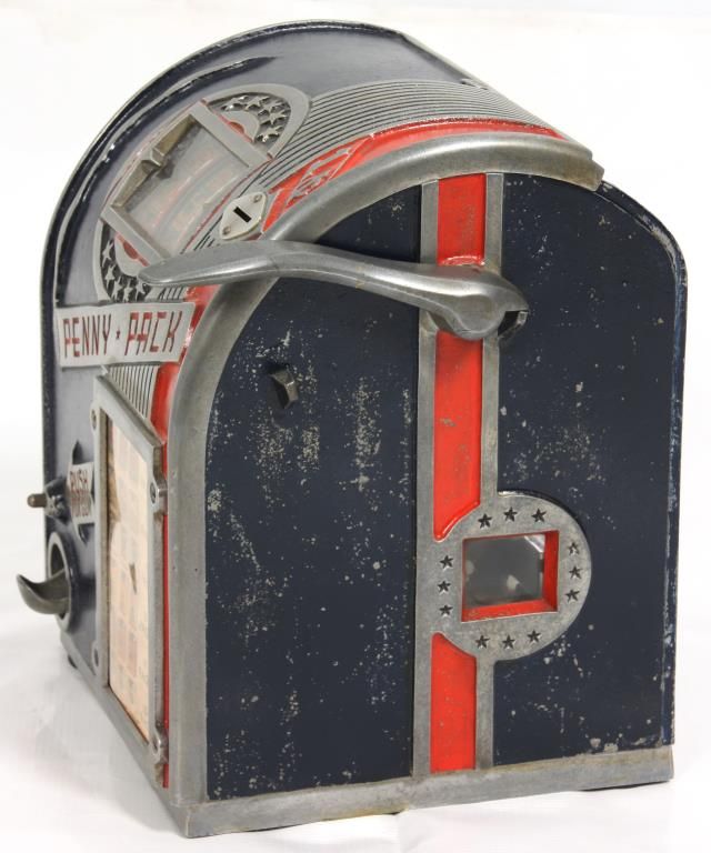 Penny Pack Trade Stimulator. By Daval Manufacturing. Co., has a hump top case with painted blue and red background, viewing glass on top with 3 painted cigarette reels and gumball dispenser. 1 cent machine in good working condition with some typical paint wear, circa 1930’s. 11 in. high x 9 in. wide x 8.5 in. deep.