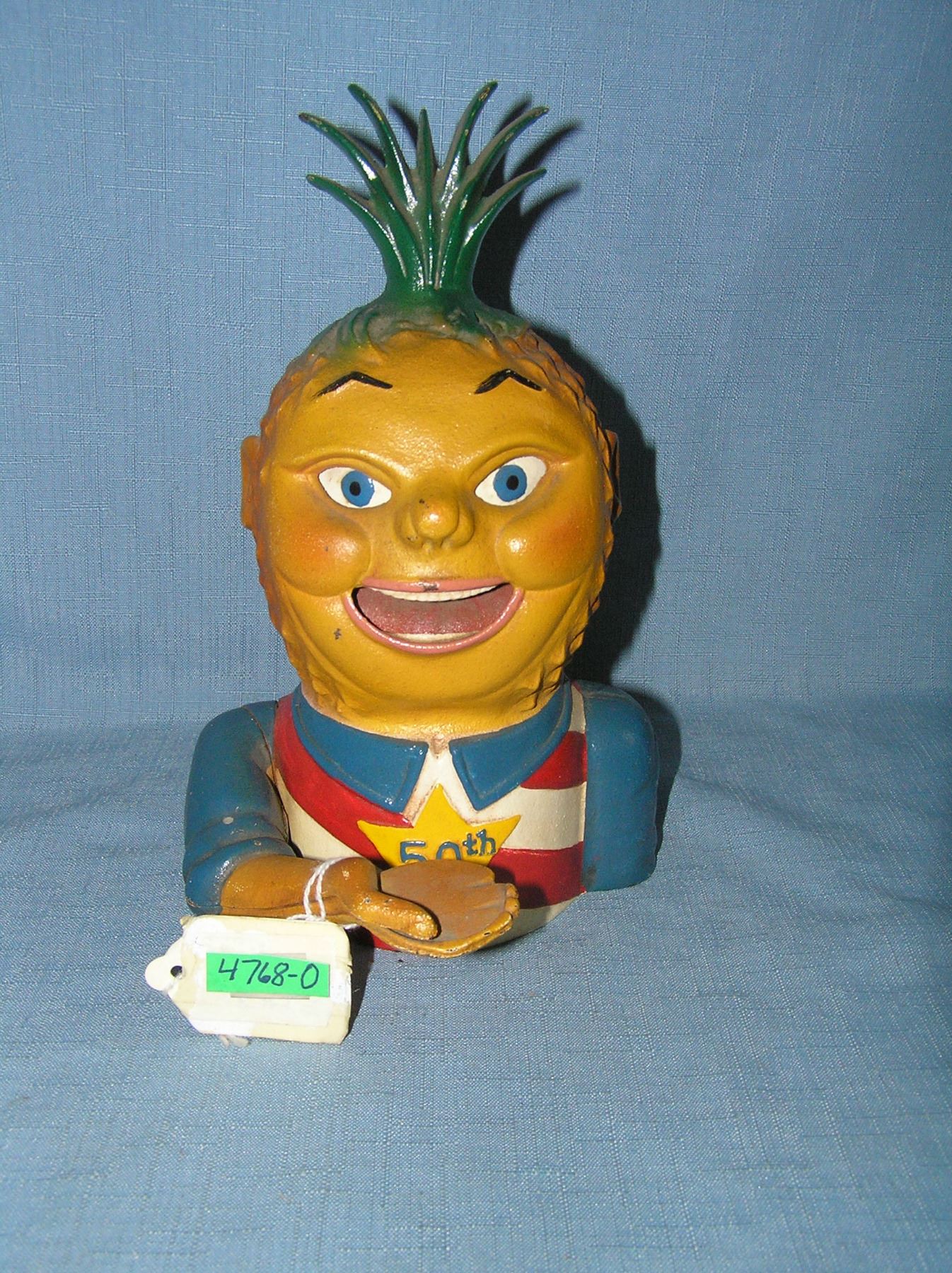Penny Pineapple cast iron mechanical bank circa 1960s celbrating the 50th state of Hawaii est. value $750.00-$800.00