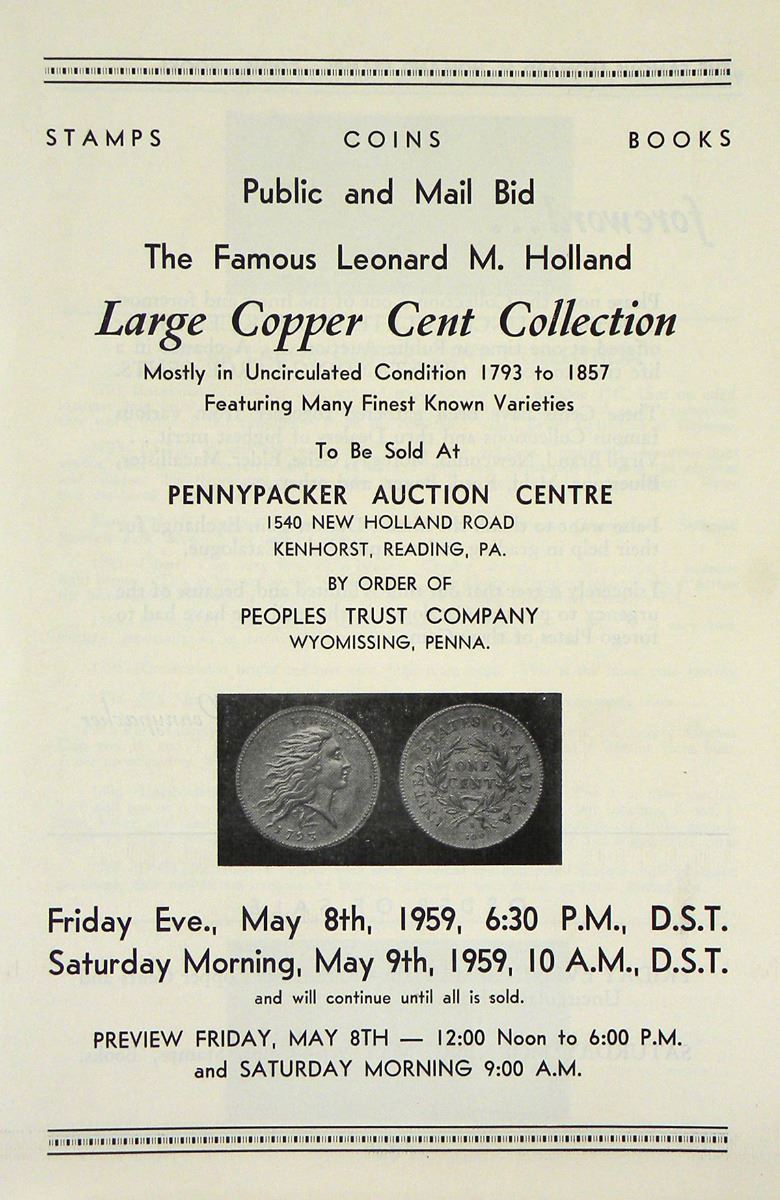 Pennypacker Auction Centre. STAMPS - COINS - BOOKS. PUBLIC AND MAIL BID. THE FAMOUS LEONARD M. HOLLAND LARGE COPPER CENT COLLECTION. MOSTLY IN UNCIRCULATED CONDITION 1793 TO 1857, FEATURING MANY FINEST KNOWN VARIETIES. Reading, Pa.: Kenhorst, May 8-9, 1959. Catalogued by Mason-Dixon Coin Exchange (Thomas Warfield). 8vo, self-covered. 16 pages; (103) lots of large cents; 261 lots of other coins; (11) lots of stamps; 200 lots of books; 10 halftone illustrations of large cents. Fine. The Pennypacker sale was a remarkable event, offering a fine collection of large cents assembled in the late 1940s and 1950s, mostly acquired from Leonard Holland’s good friend Thomas Elder. Holland pledged the collection as collateral for a construction project loan in the late 1950s. He encountered unforeseen difficulties and the bank foreclosed the loan, choosing an obscure country auctioneer to liquidate the collection. Distribution of the catalogue was limited and the coins generally sold for low prices. Some of the important collectors of the day did not learn of the sale and several of the attendees funneled their bids through a single agent. After the sale, it is reported that the coins were again auctioned within the group in a hotel room. Sometimes, the differences were dramatic, with coins subsequently bringing double or triple the original hammer price.