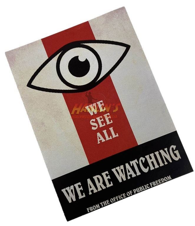 Original "We See All - We Are Watching" flyer used in the drama television series 'Pennyworth' (2019), based on characters published by DC Comics and created by Bob Kane and Bill Finger, that premiered on July 28, 2019. Starring Jack Bannon as the titular character, alongside Ben Aldridge, Ryan Fletcher, Hainsley Lloyd Bennett, Paloma Faith, and Jason Flemyng. The story of Alfred Pennyworth, a former special-forces officer living in London and working for Bruce Wayne's father.