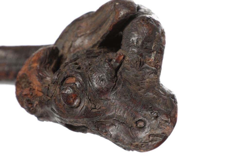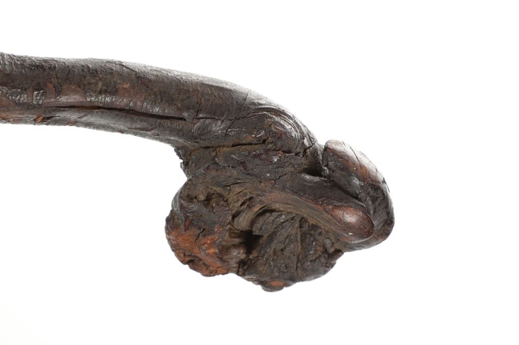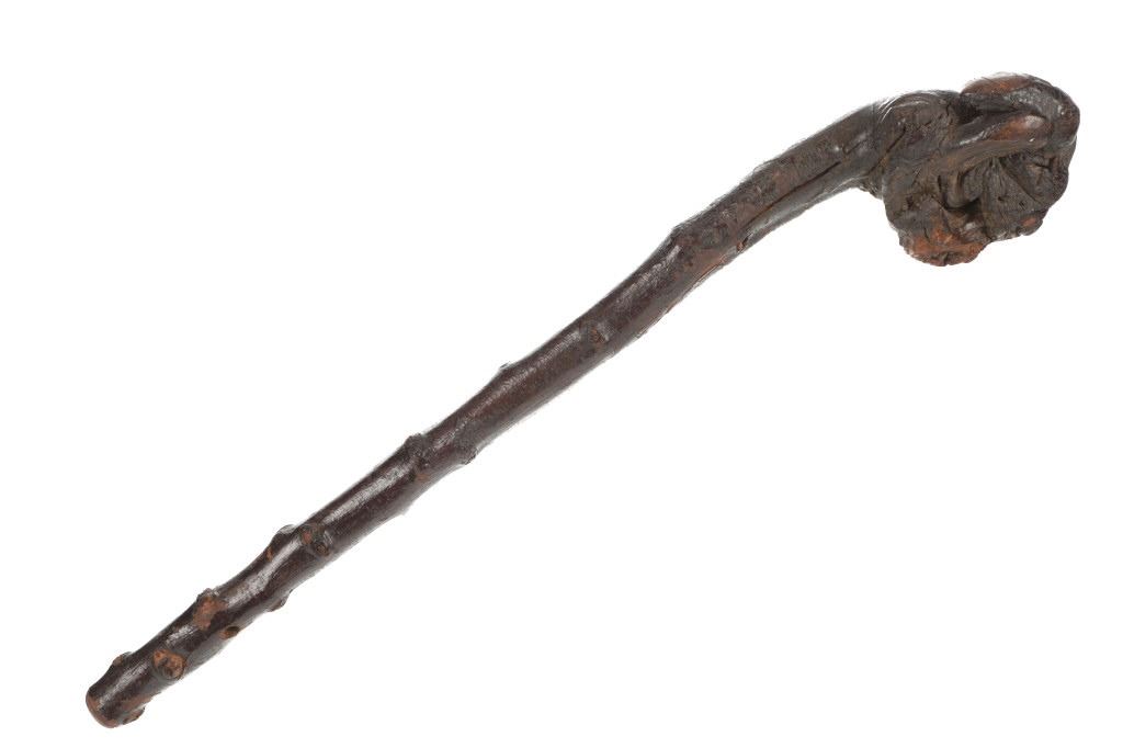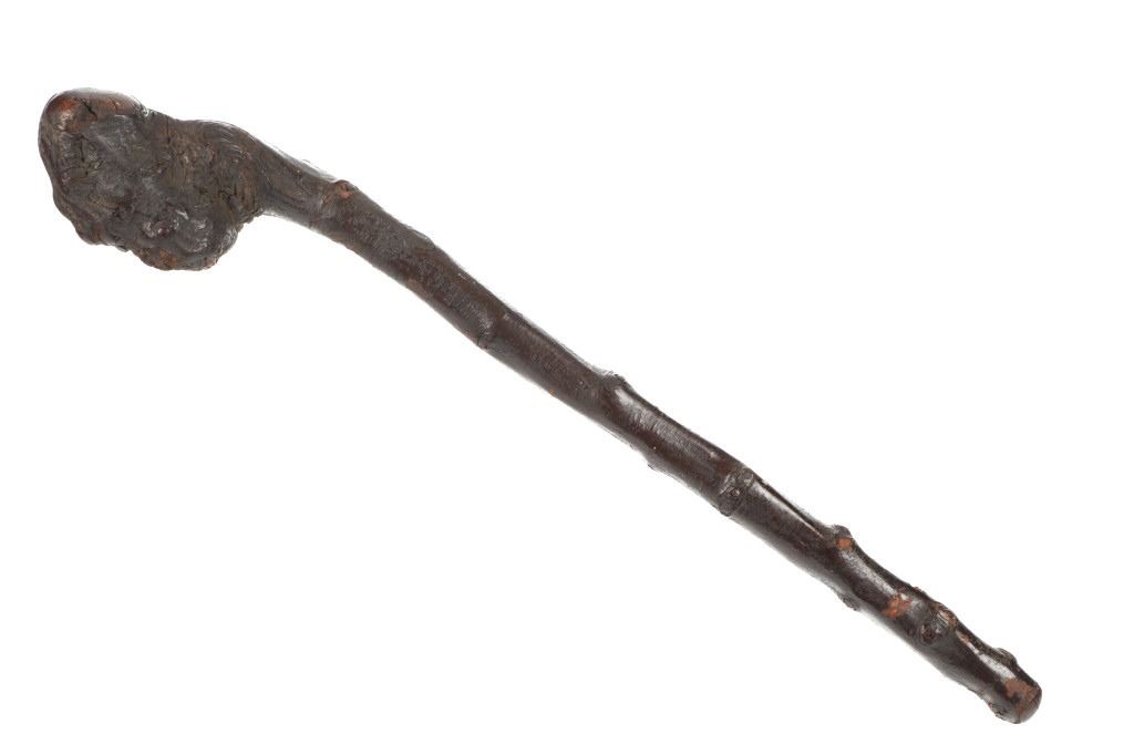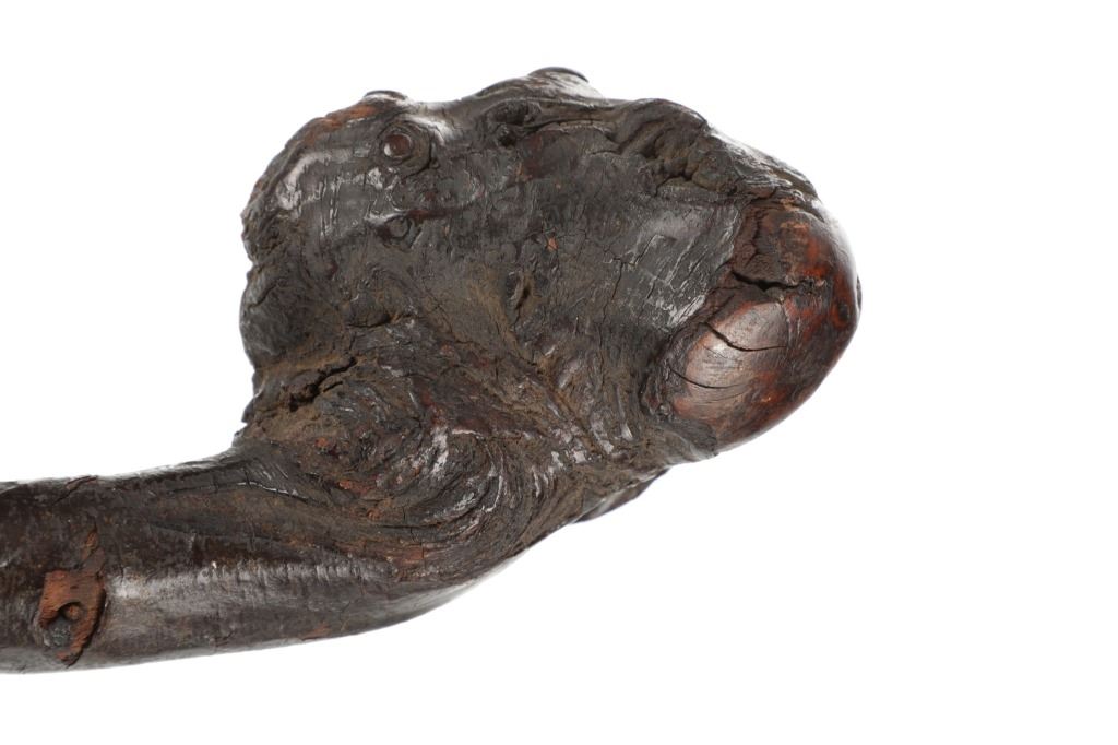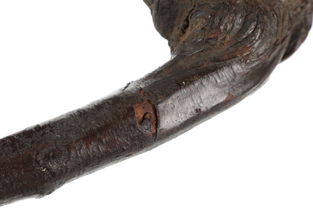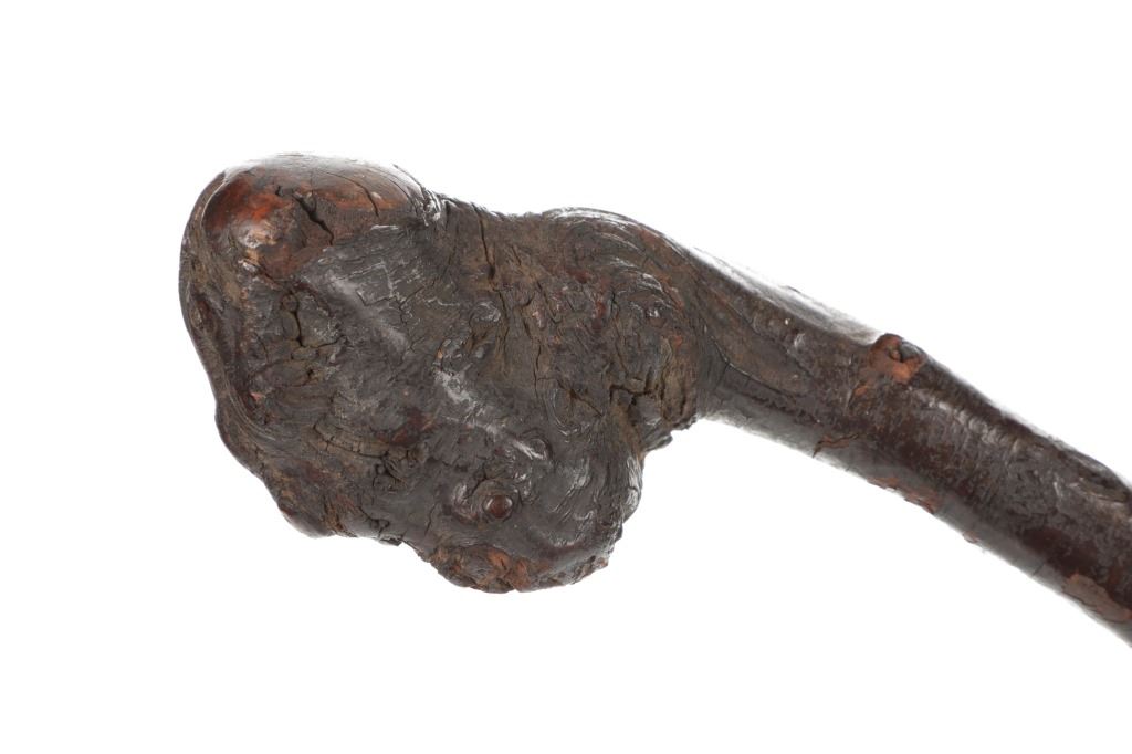 The lot features a Penobscot Northeastern Native American Indian carved burl ball head war club from the 19th Century. This examples has a traditional ball head pattern with solid all one piece hand carved construction having a brand with bark on haft handle having a downward curved root burl ball head. The piece has a dark coloring and deep patina from honest very early age. The bottom of the gripping area has a drilled hole. The club overall has a dark coloring and shiny patina from honest age and use and polished carved round knob end and polished carved ball head with irregular root burl appearance, common amongst authentic Penobscot Northeastern (Maine) Native American Indian examples such as this. Provenance: From a large Iowa private collection of weapons and Native American beadwork. Measures overall 23.5”L with the head being approximately 4”x4.5”x4”.