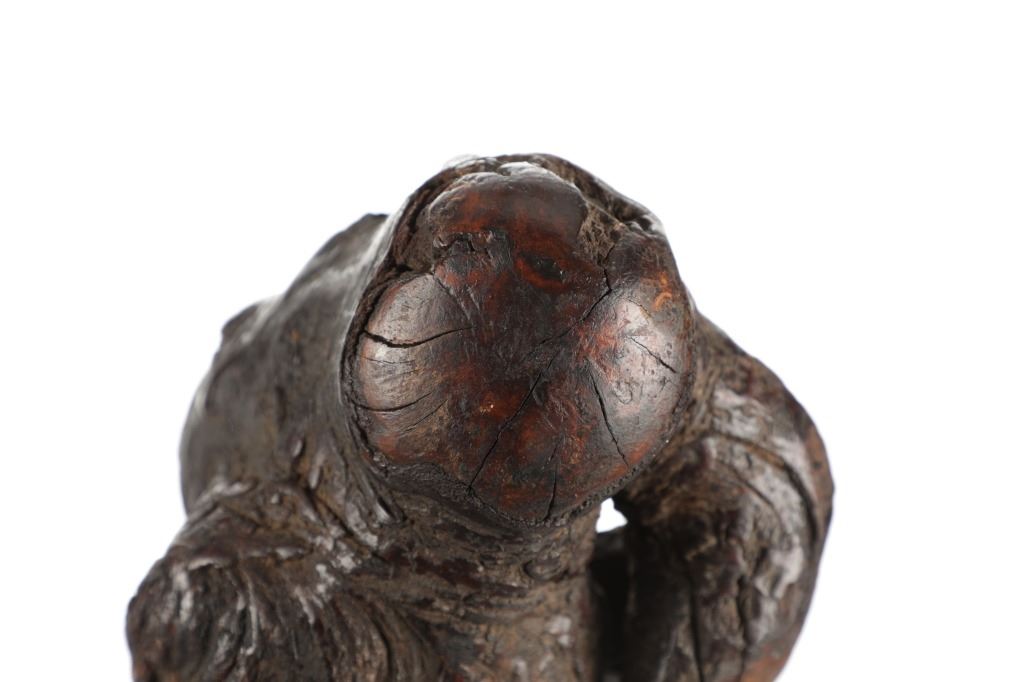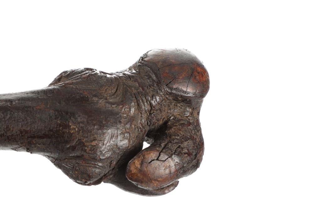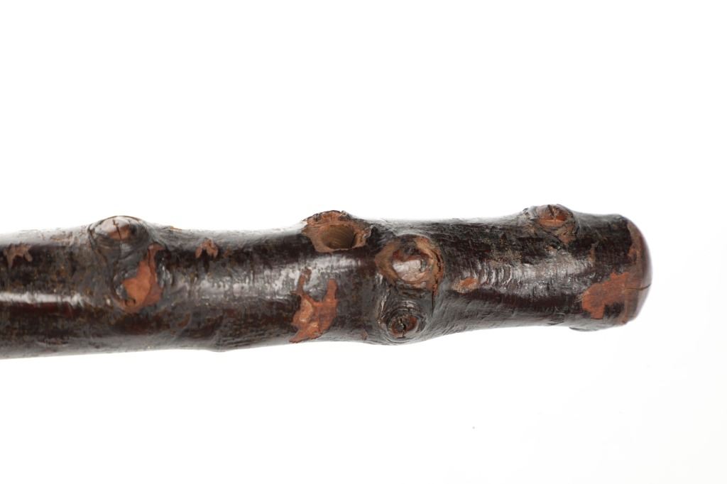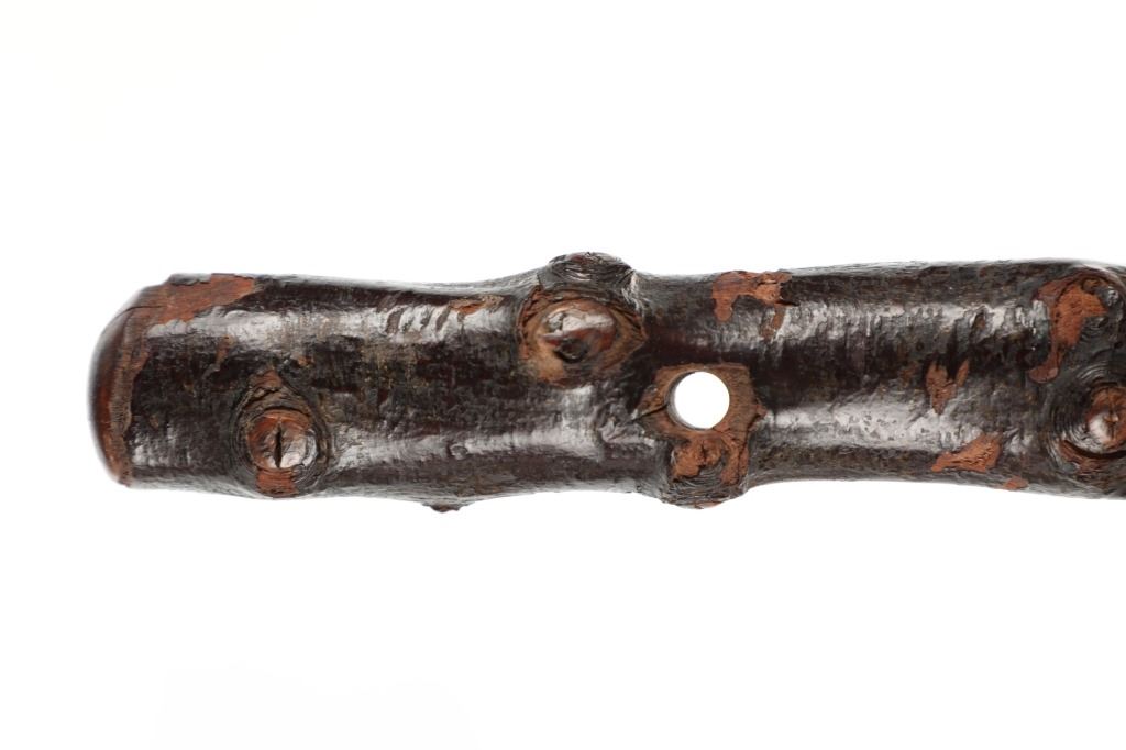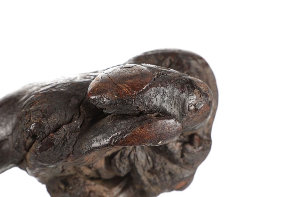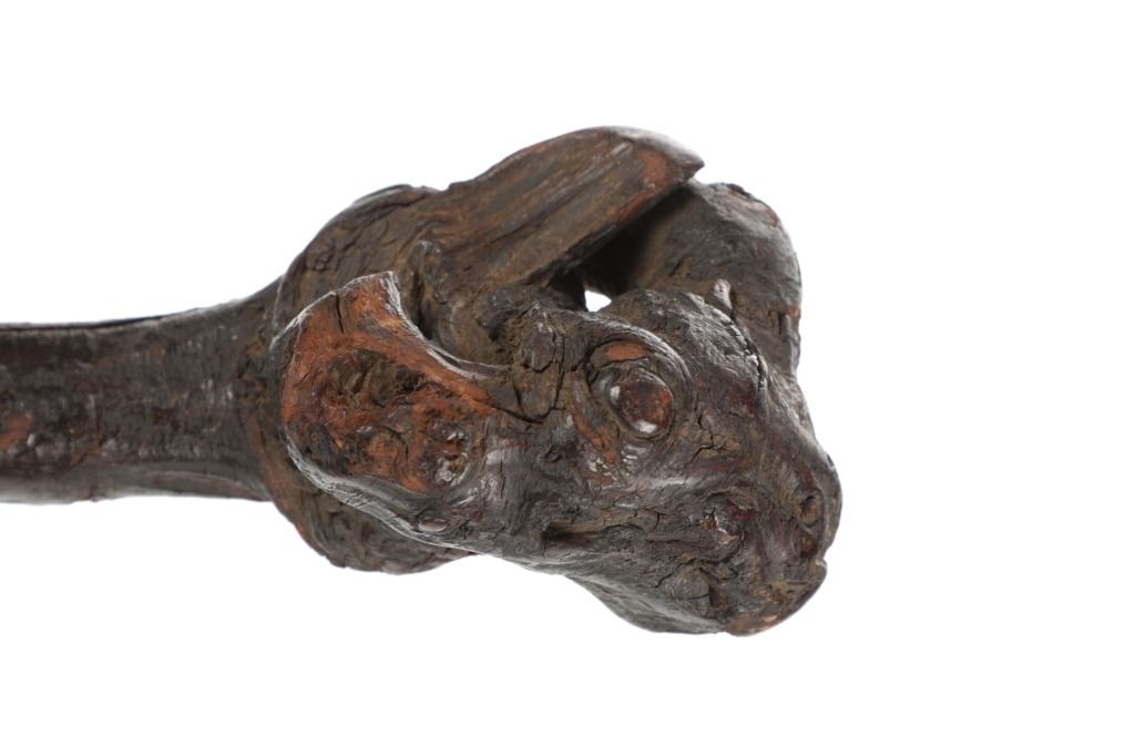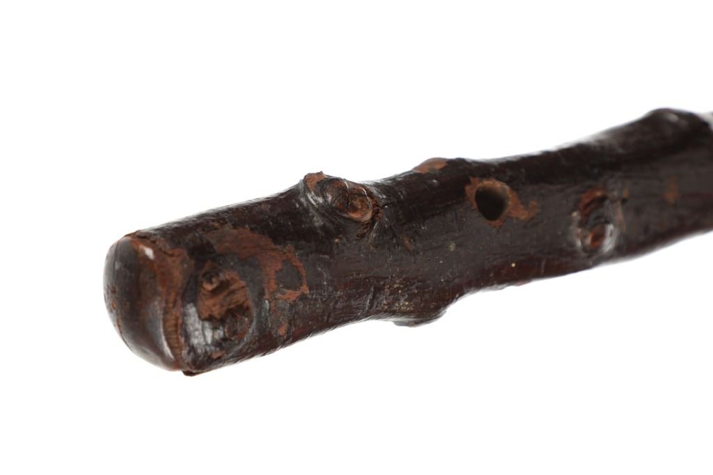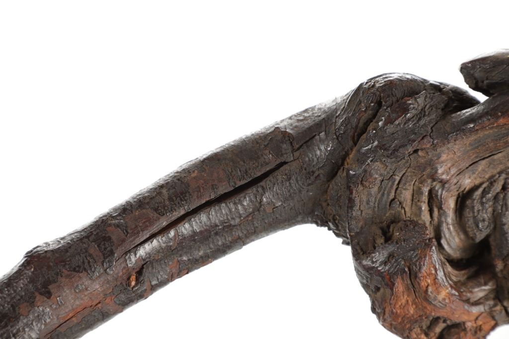 The lot features a Penobscot Northeastern Native American Indian carved burl ball head war club from the 19th Century. This examples has a traditional ball head pattern with solid all one piece hand carved construction having a brand with bark on haft handle having a downward curved root burl ball head. The piece has a dark coloring and deep patina from honest very early age. The bottom of the gripping area has a drilled hole. The club overall has a dark coloring and shiny patina from honest age and use and polished carved round knob end and polished carved ball head with irregular root burl appearance, common amongst authentic Penobscot Northeastern (Maine) Native American Indian examples such as this. Provenance: From a large Iowa private collection of weapons and Native American beadwork. Measures overall 23.5”L with the head being approximately 4”x4.5”x4”.
