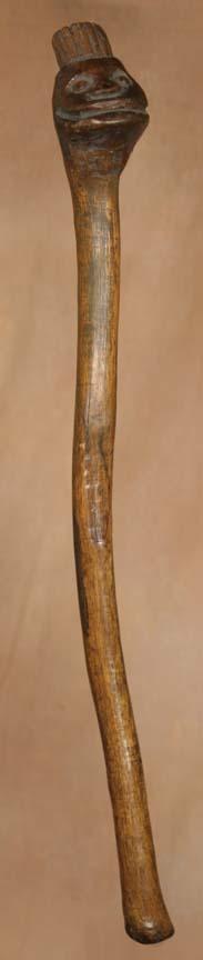 Penobscot Ceremonial Club. 24" long. Carved face. 19th century. (est $1,000-2,000). For condition reports please visit: www.auctioninsantafe.com/cr2011.pdf