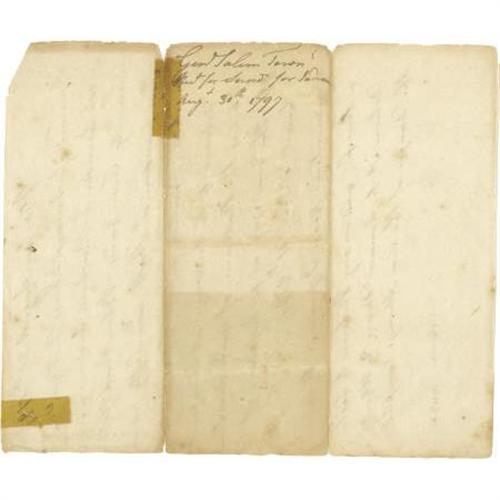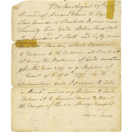 <B>(Penobscot Indians) Manuscript Document Signed.</B></I> One page, 7.75" ´ 9.25", Boston, August 29, 1797 a receipt for a quantity of Indian corn, blue broadcloth and "<I>fifty pounds Musket powder</B></I>", which was promised to be delivered to the "<I>Indians at Penobscott</B></I>" being the "<I>balance of goods due to the Indians as per court resolve of Feb, 11, 1797</B></I>". Toning from tape repairs on verso, partial fold separation, light foxing, else good. <I>Ex. Henry E. Luhrs Collection.</B></I><BR><BR><BR><b>Shipping:</b> Flat Material, Small (<a target="_blank" href="http://www.heritageauctions.com/common/shipping.php">view shipping information</a>)