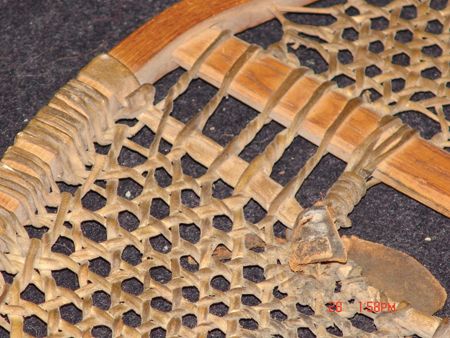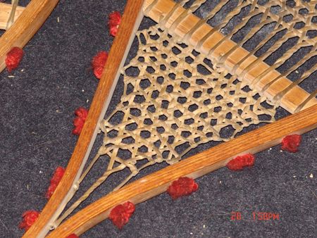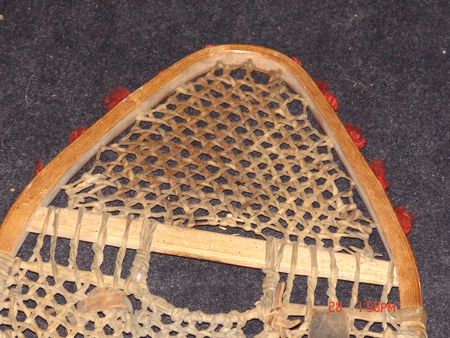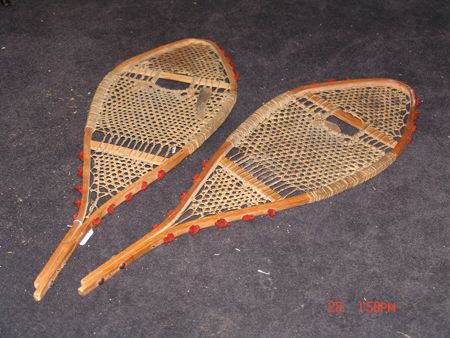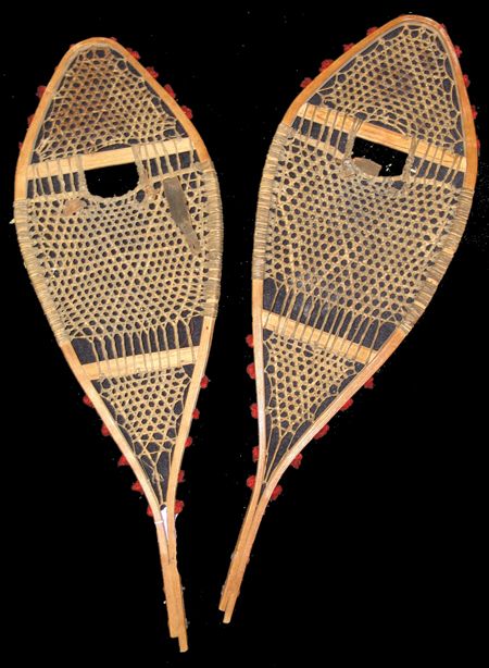 Ca. 1890, Classic old pair of handcrafted bentwood and laced rawhide snowshoes accented with red wool tufts. Very good condition. Excellent patina. A great example. Ex. Emily Jeffs Frazier Collection. From the Herb and Peggy Puffer Collection, Folsom, 1" x 34" x 11-1/2" each