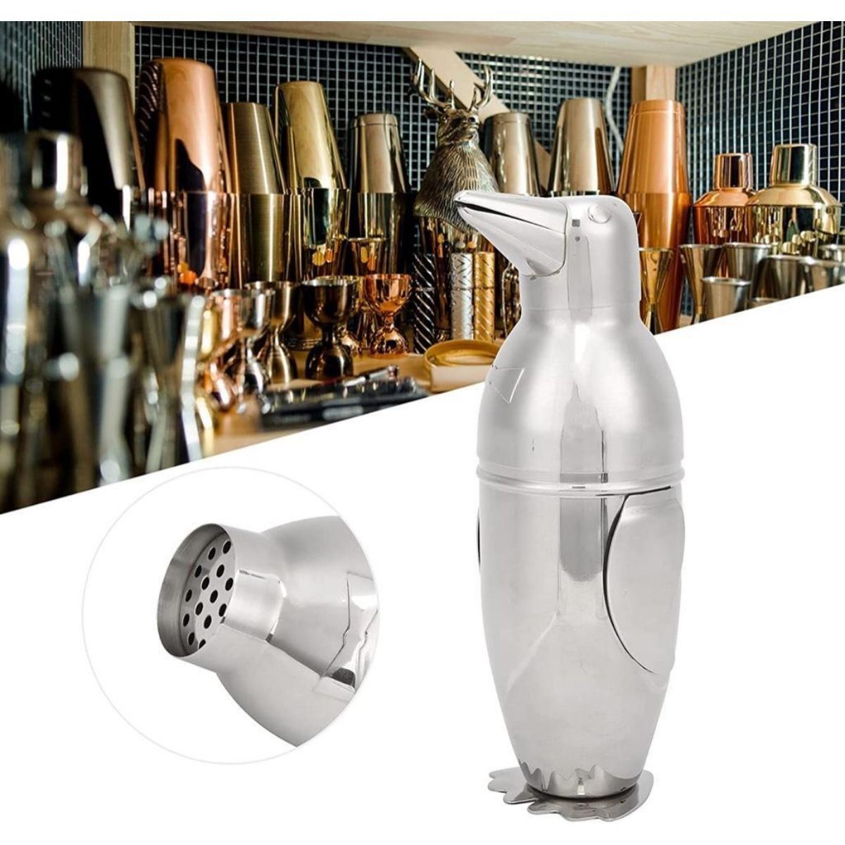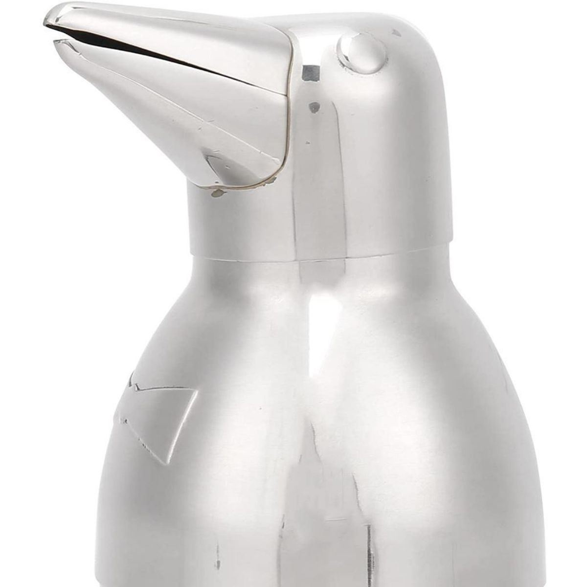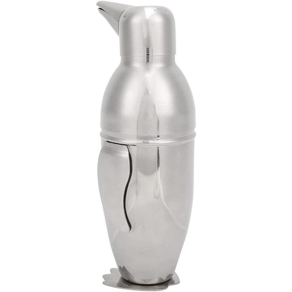 Retro style, novelty stainless steel Penquin Cocktail Shaker with built in strainer, bartender tools, built-in filter and bottle cap, which can double as a measurement standard,. 500ml capacity. 9" H.