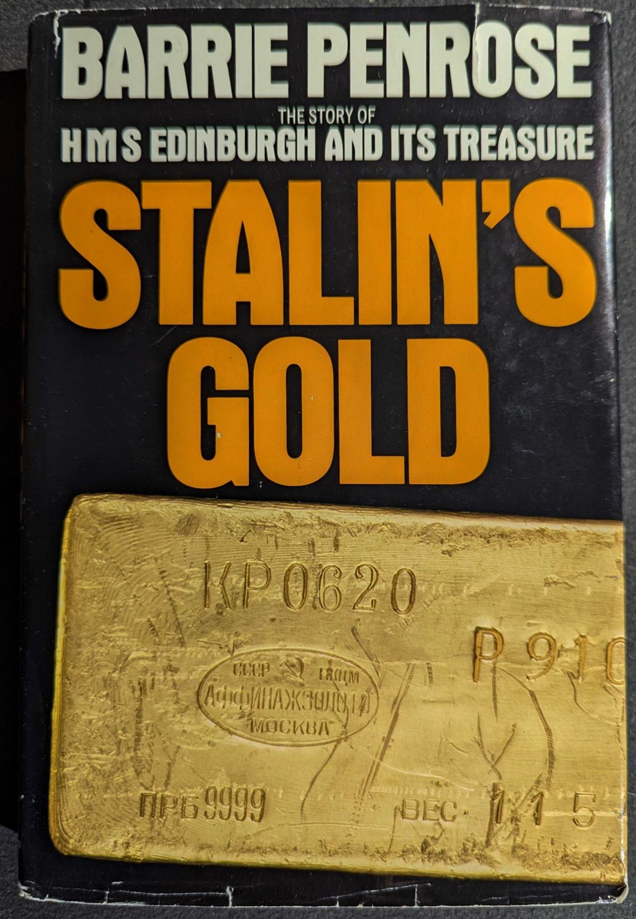 Penrose, Barrie. STALIN'S GOLD. THE STORY OF HMS EDINBURGH AND ITS TREASURE. Little, Brown and Company. 1982. 8vo. xiii, (3), 223, (3) pages. Boston. first American edition. original olive cloth, gilt; dust jacket. illustrations. map. Fine. This book relates the story of the sinking of the 'HMS Edinburgh' in 1942 in 800 feet deep arctic waters. On board were 465 gold bars. The book also documents the successful search and recovery of the bullion in 1981. Authored by the newspaperman that covered the salvage operation. Lot weight: 1 lbs 5oz. Subject(s): Sunken Treasure.
