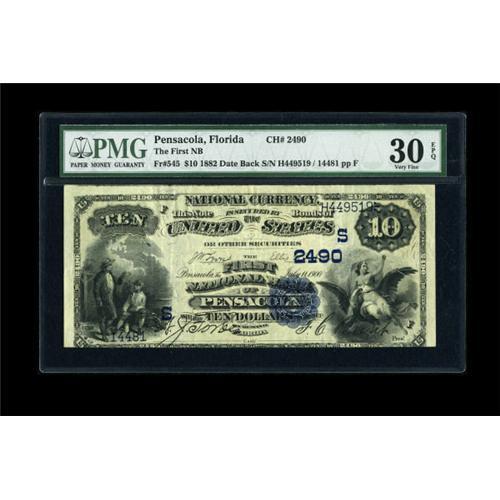 <B>Pensacola, FL</B></I> - $10 1882 Date Back Fr. 545 <B>The First NB</B></I> Ch. # (S)2490<BR> While the bottom margin is trimmed a bit into the design, this higher grade piece has retained considerable eye appeal, not surprising in view of its EPQ designation. PMG <B>Very Fine 30 EPQ.</B></I><BR><I>From The Sunshine State Collection.</B></I><BR><BR><b>Shipping:</b> Coins & Currency (<a target="_blank" href="http://www.heritageauctions.com/common/shipping.php">view shipping information</a>)