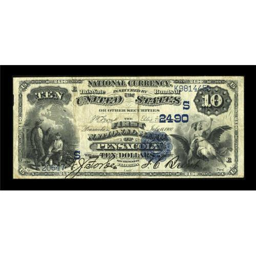 <B>Pensacola, FL</B></I> - $10 1882 Date Back Fr. 545 <B>The First NB</B></I> Ch. # (S)2490<BR> Rich black printed signatures enhance this $10 from a bank which went into receivership in 1914. <B>Very</B></I> <B>Fine</B></I>.<BR><BR><b>Shipping:</b> Coins & Currency (<a target="_blank" href="http://www.heritageauctions.com/common/shipping.php">view shipping information</a>)