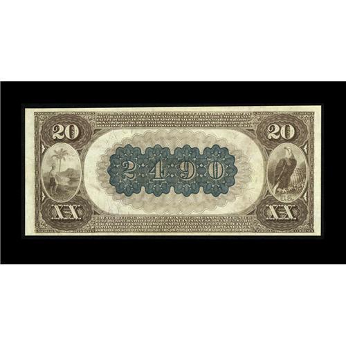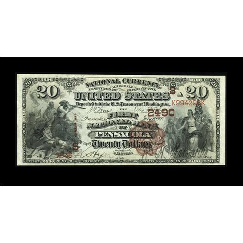 <B>Pensacola, FL</B></I> - $20 1882 Brown Back Fr. 504 <B>The First NB</B></I> Ch. # (S)2490<BR>This <B>Extremely Fine+</B></I> $20 gives the impression of a higher grade at first glance. It possesses excellent colors and ample margins. The stamped signatures are present, while the edges are sharp, too. Add all this to the fact that it is one of only two $20 Brown Backs known on this bank and you have a truly important note.<BR><BR><b>Shipping:</b> Coin/Currency (<a target="_blank" href="http://www.heritageauctions.com/common/shipping.php">view shipping information</a>)