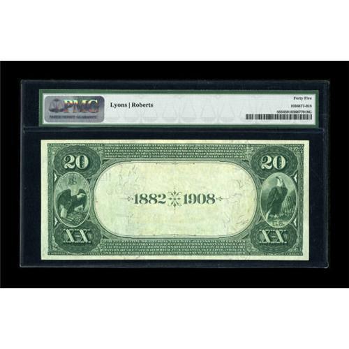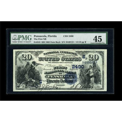 <B>Pensacola, FL</B></I> - $20 1882 Date Back Fr. 555 <B>The First NB</B></I> Ch. # (S)2490<BR> A beautifully centered example which is graded as CU in the Kelly census. While it is not, your cataloguer can certainly see why it might have been described as such in the past, as the surfaces appear to be those of a new note and the color, signatures and overall eye appeal certainly appear to support such a grade. PMG has assigned a very conservative <B>Choice Extremely Fine 45 </B></I>rating, although we suspect this note, a truly scarce Florida item in this state of preservation, will realize a price more in line with the first grade rather than the second. <BR><I>From The Sunshine State Collection.</B></I><BR><BR><b>Shipping:</b> Coins & Currency (<a target="_blank" href="http://www.heritageauctions.com/common/shipping.php">view shipping information</a>)
