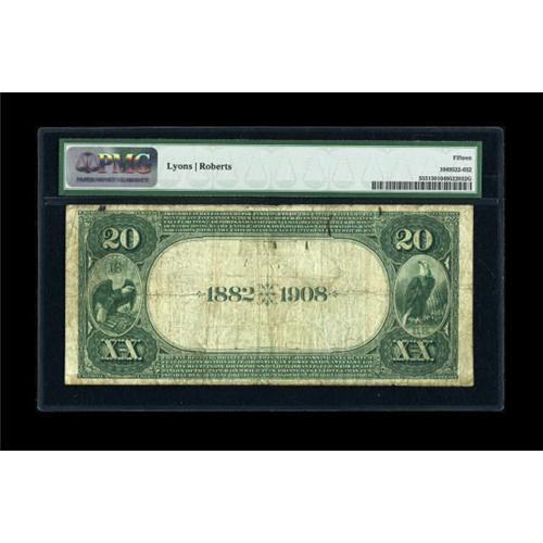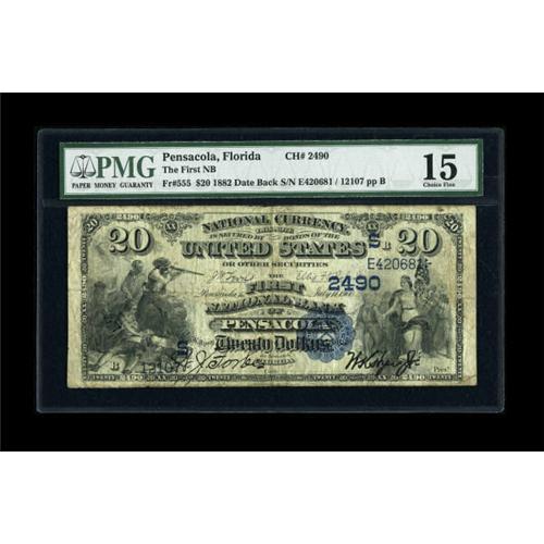 <B>Pensacola, FL</B></I> - $20 1882 Date Back Fr. 555 <B>The First NB</B></I> Ch. # (S)2490<BR> A second $20 Date Back, giving this collection a full third of the six reported $20 Date Backs listed in the census from here. PMG <B>Choice Fine 15.</B></I><BR><I>From The Sunshine State Collection.</B></I><BR><BR><b>Shipping:</b> Coins & Currency (<a target="_blank" href="http://www.heritageauctions.com/common/shipping.php">view shipping information</a>)