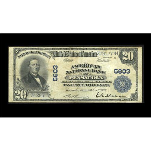 <B>Pensacola, FL</B></I> - $20 1902 Plain Back Fr. 659 <B>The American NB</B></I> Ch. # 5603<BR>Snappy paper and sound edges drape this nice Florida type National with BEP engraved signatures. <B>Fine+.</B></I>