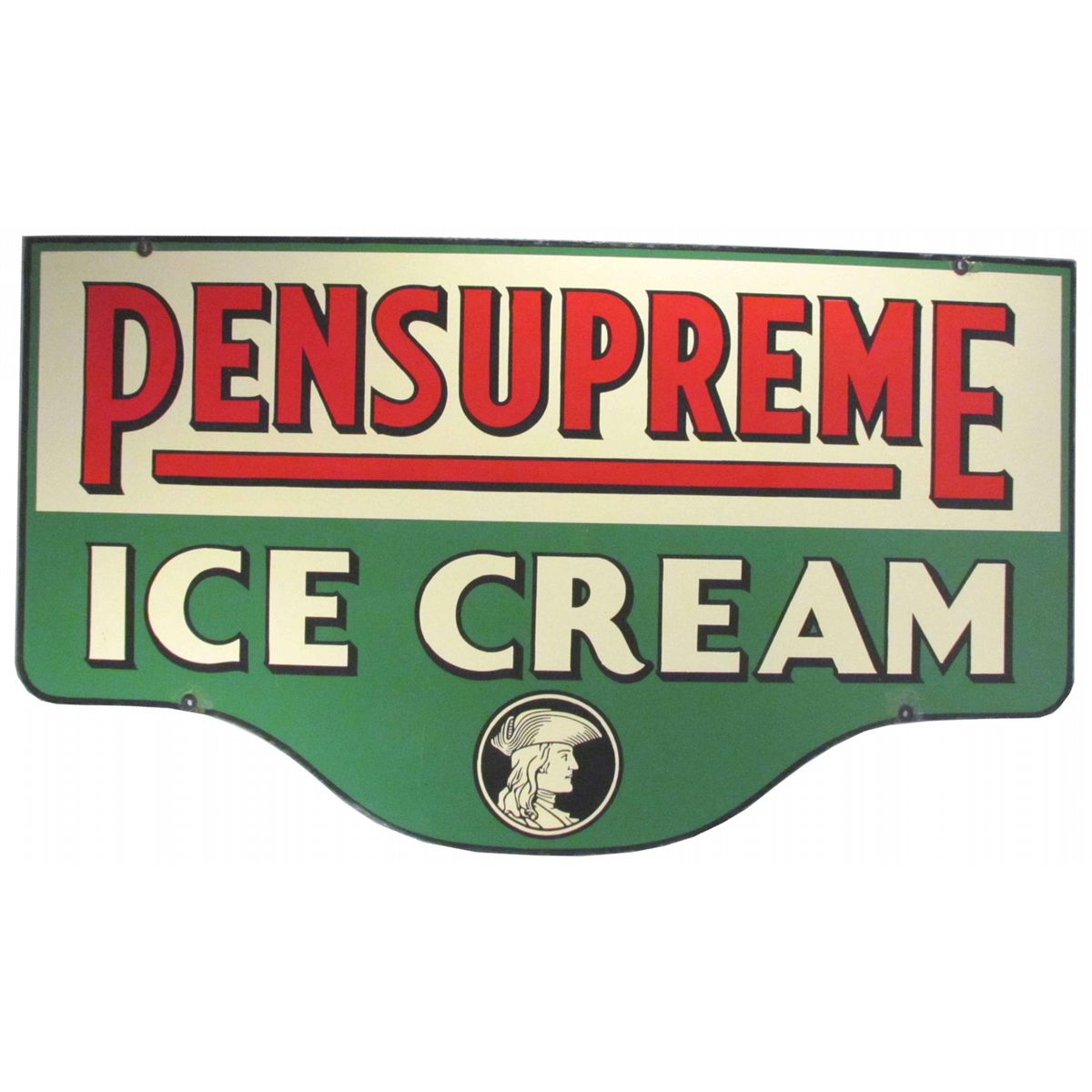Pensupreme Ice Cream die-cut porcelain sign. Repairs at grommets, otherwise excellent condition. 43 X 23 1/2 inches.