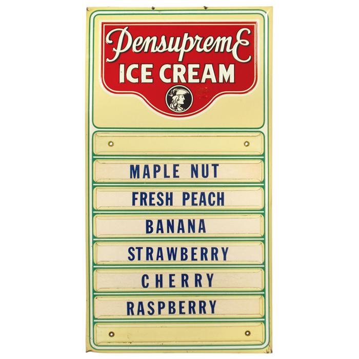 Pensupreme Ice Cream flavor board, mfgd by Permanent Sign & Display Co., Reading, PA, a litho on tin