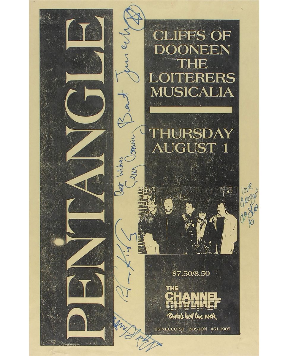 Concert flyer, 11 x 17, signed in blue felt tip by Bert Jansch, Jacqui McShee, Gerry Conway, Nigel Portman Smith, and Peter Kirtley. In fine condition, with scattered bends.