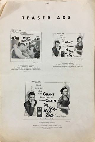 People Will Talk (Twentieth Century Fox, 1951). Black and White Advertising Ads (11). Starring: Cary Grant and Jeanne Crain. There are fold lines, creases, marks, edge wear damage and paper loss. Very Fine. (12" X 18").